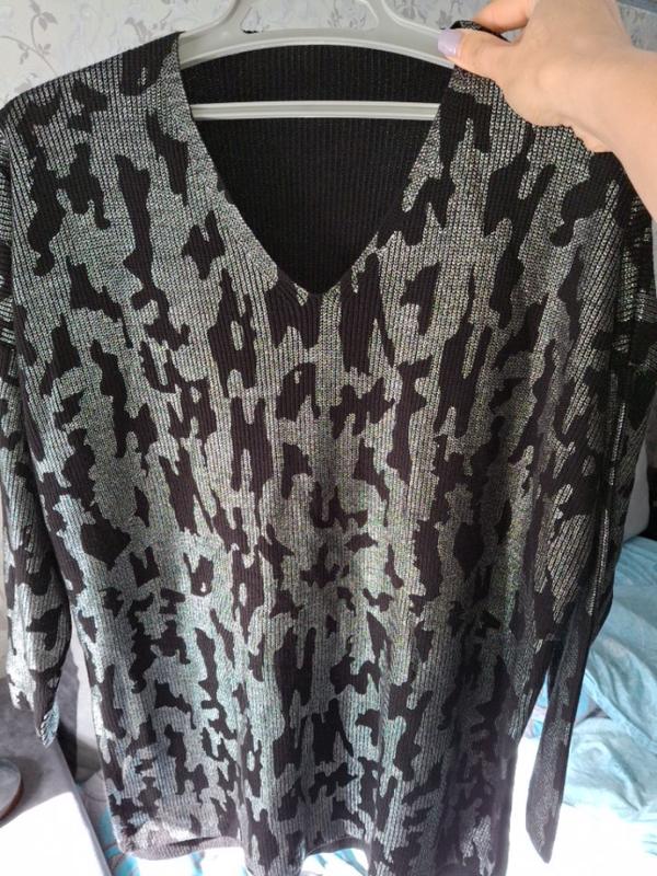 Дуже гарний вільного крою светр має по бокам розрізи спереду коротший підійде на розмір 48-52 гарної якості приємний до тіла