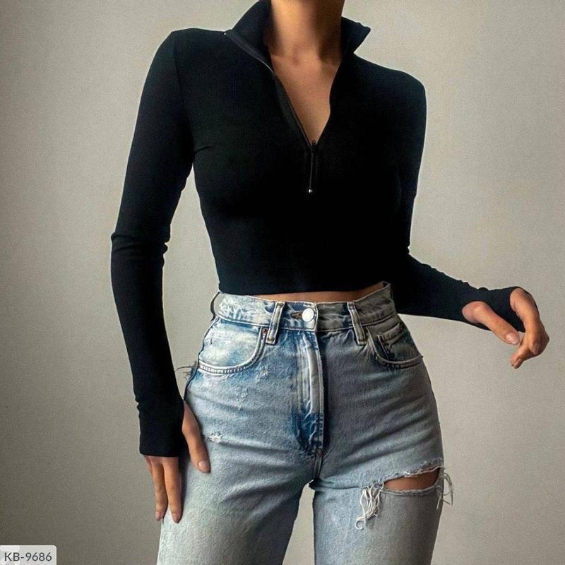 Топ KB-9686 Арт. 145 Размеры: 42-44, 44-46 Кроп-топ на замочку. Є комірець і розріз на рукаві для пальчика. Матеріал-трикотаж-рубчик. Колір-класичний чорний. Якість і пошиття Фото реал