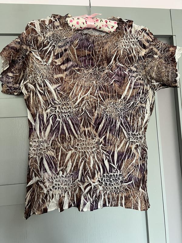 Оригінальна кофточка, жатка- футболка, розмір від м до хл. Коли розтягується, дуже гарні візерунки, стан чудовий, дефектів нема, довжина- 60см, ширина під руками- 45-60см( тягнеться)
