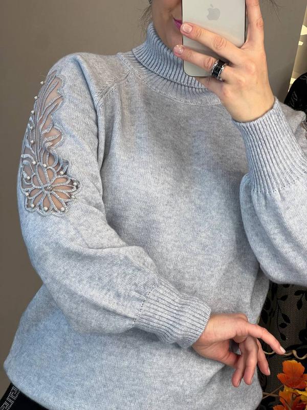 теплий, комфортний і ефективний светр з високим горлом виготовлений з приємного до тіла трикотажу рельєфної машинної в'язки високої якості, декорованого аплікацією з прозорої сітки і пришитих перлин ,він зігріє вас у прохолодну пору року і займе гідне місце у вашому гардеробі розмір єдиний 46-52 довжина 60-62 см, на ог від 96 до 114 см добре тягнеться, довжина рукава від шиї 70-72 см код 0530