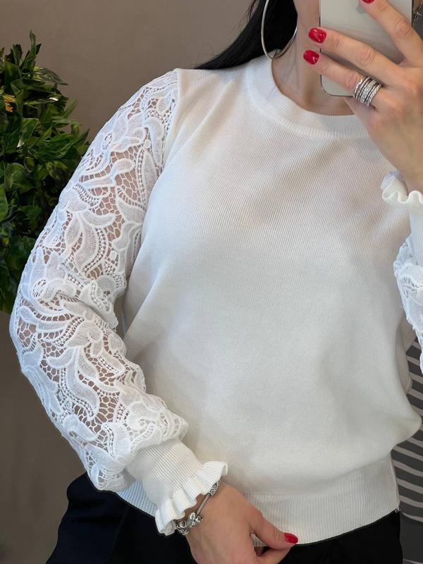 Надзвичайно красива, елегантна і ефектна кофточка вільного крою на резинці вгорі і внизу з чудовими об'ємними рукавами з ніжного мережива з дивовижним візерунком кофточка виготовлена з якісного і приємного до тіла трикотажу машинної в'язки, вона підкреслить вашу красу, і відмінно буде виглядати на діловій зустрічі, романтичному побаченні і вечірнику з друзями розмір універсальний 42-46 довжина 56-58 см, пг 48-50 см добре тягнеться, довжина рукава від шиї 68-70 см код 02