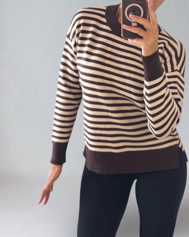 Светр Тепла модель в смужку, спинка подовжена, розрізи з боків Модель: 9880 Склад: машинне в’язання 70% cotton, 25% viskoea, 5% elastna Розмір: універсальний (42-46) Довжина виробу 61/66 см Довжина рукава 69 см Ширина під пахвами 54 см