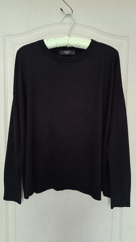 Светр від преміального бренду Weekend Max Mara в чорному кольорі. Модель вільног крою із заниженою лінією плеча. Круглий виріз горловини, довгі рукава. Горловина, манжети та низ светра – в рубчик. Боковий шов злегка переходить по косій на перед з невеликими розрізами. Склад: 79% віскоза, 21% поліамід. Розмір вказаний М. Заміри: Ширина плечі – 64,5 см Напівобхват грудей – 62,5 см Ширина внизу – 54 см Довжина по середині спинки – 57 см Довжина рукава – 45 см, довжина плеча – 24 см Всі заміри зроблені без розтягування. Светр тягнеться.