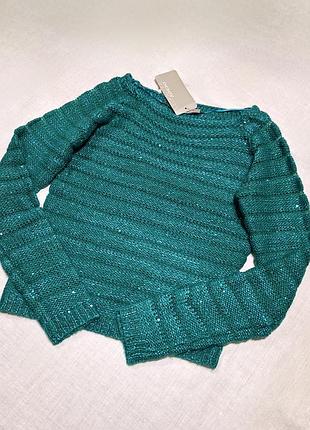 Дуже гарний в'язаний светр Розкішний зелений колір Дрібні пайєтки виблискують на світлі Підійде для струнких жінок або дівчаток-підлітків Заміри: Ширина в грудях 41см Довжина рукава від горловини (рукав реглан) 65 см Довжина 50 см