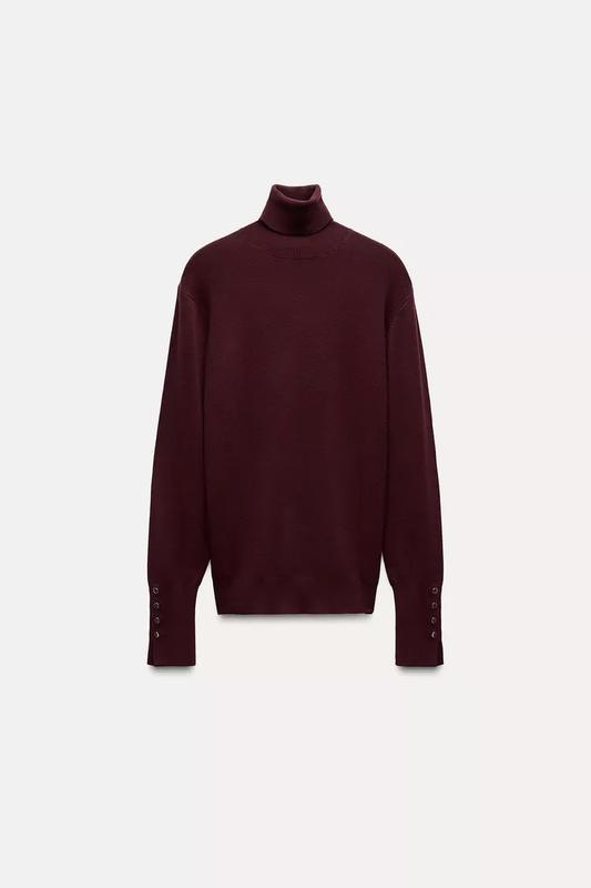 Светр із високим коміром-хомутом, довгими рукавами з ґудзиками і окантовкою в рубчик по краях. Бордовий | 8851/180