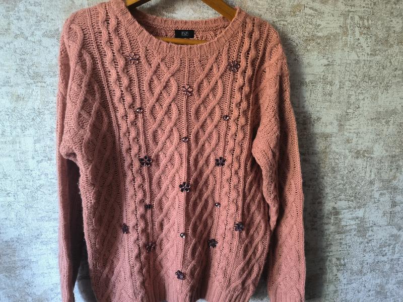 Светр жіночий F&F. Розмір 14 британський (L). Акриловий, прикрашений стразовими квіточками. В ідеальному стані. Довжина 68 см, рукав 66, напів обхват грудей 55