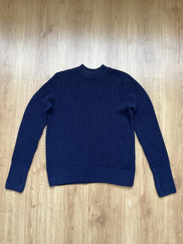 Свитер Cos темно-синего цвета с удлиненными рукавами и с отверстием для большого пальца. Состав: хлопок 97%, полиамид 3%. Размер М. Объем по груди 104 см, объем по низу 94 см, длина плеча 13 см, длина рукава 67 см, длина изделия 63 см.