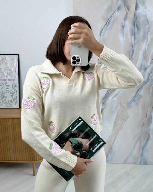 Светр Модель 4198 Бомбезний укорочений светр з вишитими шовковими нитками ягідками Відкладний комір , фактурна вʼязка на рукавах та по низу светрика Виробник Туреччина 🇹🇷 НОГ-50 см Довжина-48 см Довжина рукава від горловини-70см