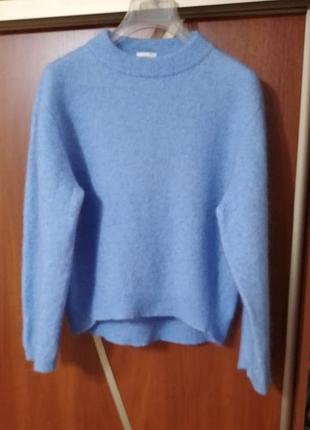 Стильный свитер джемпер бренда Second Female Дания. Размер M. Состав: 34% мохер, 34% шерсть, 27% полиамид, 5% эластан. Теплый, не колется. Идеальное состояние. Цвет голубой с сиреневым подтоном. Замеры: длина спереди 54 см, сзади 60 см, пог 54 см, по низу 45 см, плечи спущенные, рукав от горловины 69 см, ширина рукава в манжете 14 см