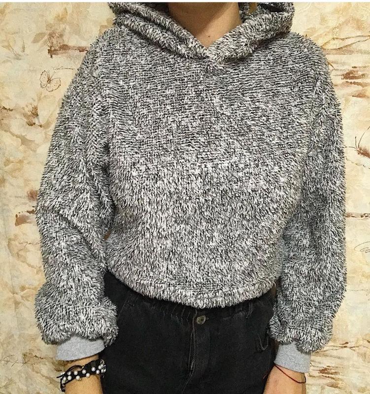 Мягкий свитер пушистый с манжетом на рукавах с капюшоном укороченый можно и на хс