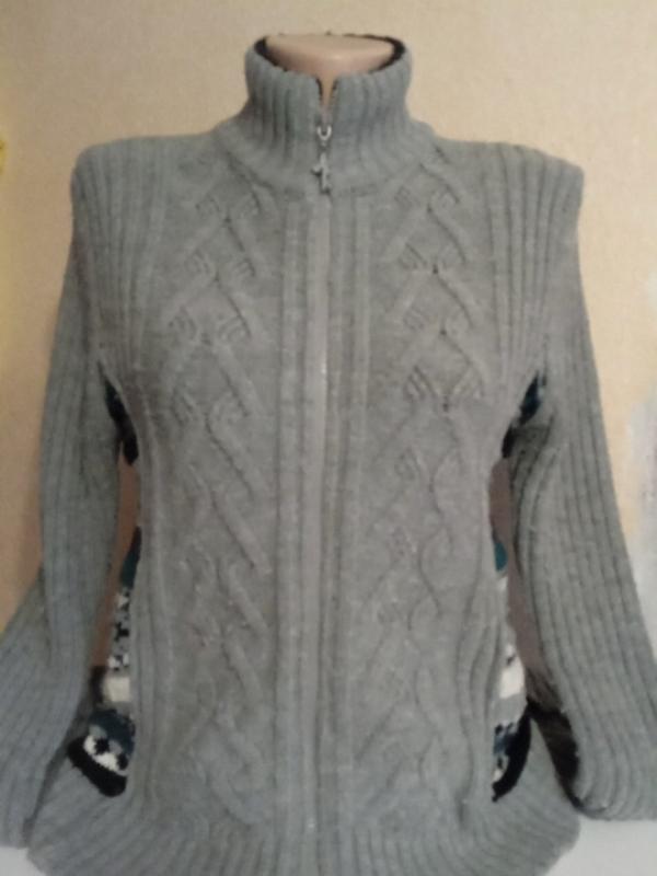 Теплая кофта с двусторонней молнией. Тканина вовна. На спине орнамент, смотрится отлично. Трещи утяжели рукава, нужно подвернуть. Размер 46-48.