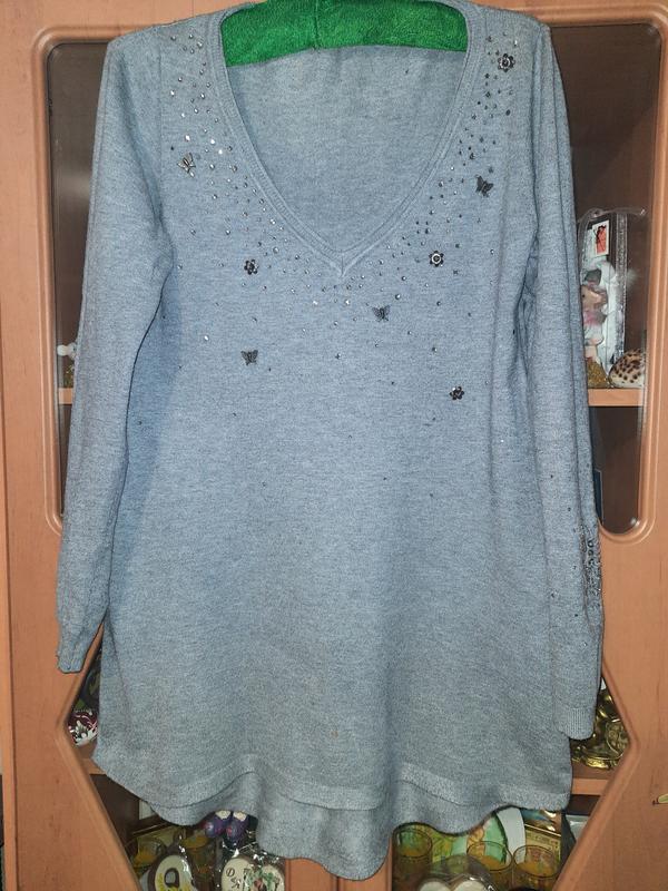 Дуже гарна кофтинка/тунічка Спереду камінчики із метеликами На рукаві також дуже гарна вишивка метелика з камінчиками Плечі - 37 см + Рукав від плеча - 63 см Від пройми до пройми - 46 см + Довжина : перед - 72 см зад - 79 см Колір : мокрий асфальт В новому стані тільки трішки є катишків з одного боку. Розмір написано M/L