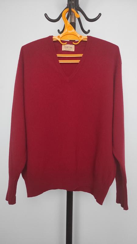 Теплый свитер красного цвета, на 100% выполнен из уникальной шерсти super geelong. Фасон свободный. Есть нюанс (зашитая аккуратно спереди, в носке не заметно совсем, фото 5). Длина изделия 62 см, ПОГ 57 см, плечи, 48 см, рукав от плечевого шва 59 см. Изготовлено в Шотландии. Бренд Barrie относится к люксовому сегменту.