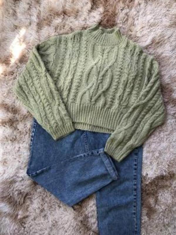 Дуже гарний фісташковий колір, не сірий. Найближче до реального фото 1. Светр мягкий, легкий, теплий, 9% шерсті (бірка фото 3). Заміри: плече-17см, рукав -57см, ПОГ- 48см, низ - 42см, довжина -47см. Розмір підійде на XS, S, M.