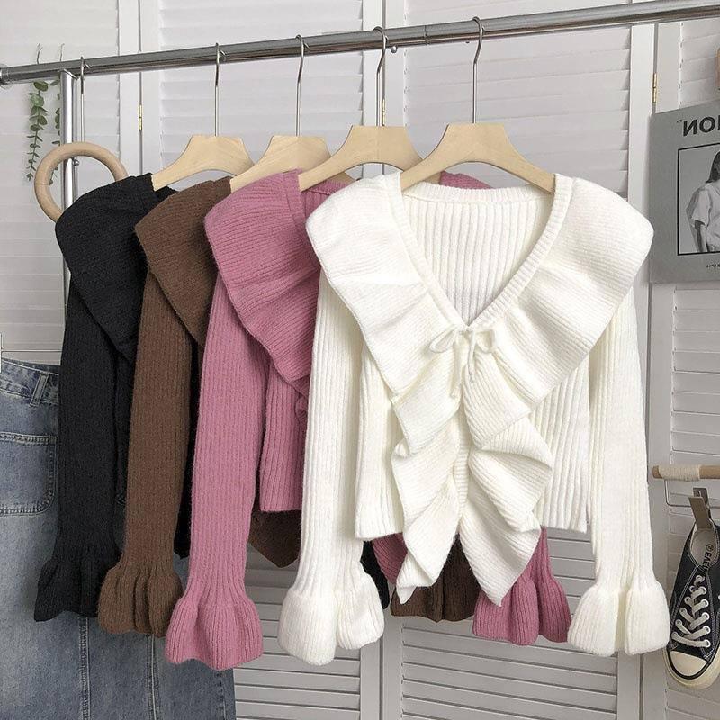 Красива в'язана кофтинка з V-подібним вирізом прикрашена воланами❤️🔥 Мод 2497 Колір: білий, чорний, шоколад, пудра Розмір: універсал 42-44 Тканина: машинна в'язка