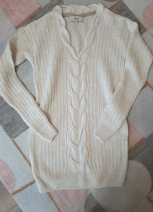 Подовжений светрик з гарним вирізом, плечовий шов спущений. Колір молочний. Розмір 6/хс. Довжина 75см. Стан ідеальний.