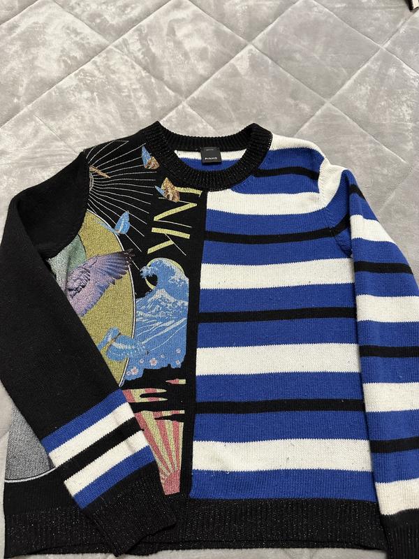 Яскравий та теплий в хорошому стані, зовсім трохи катишків, видно коли придивлятися дуже, в складі 30% вовни та 5% кашеміру, приємний до тіла.