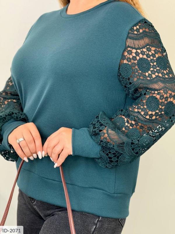Кофта ID-2071 мод.0163 Розмiри: 48-50, 52-54, 56-58 Тканина: Джерсі Колір: марсала, пляшка, білий, синій, чорний. Довжина виробу 60см. Довжина рукава: 55см + 5см манжет. Мереживо на рукавах може змінюватися. ОГ: 56/60 / 64см. ОТ 52/54/58 см.