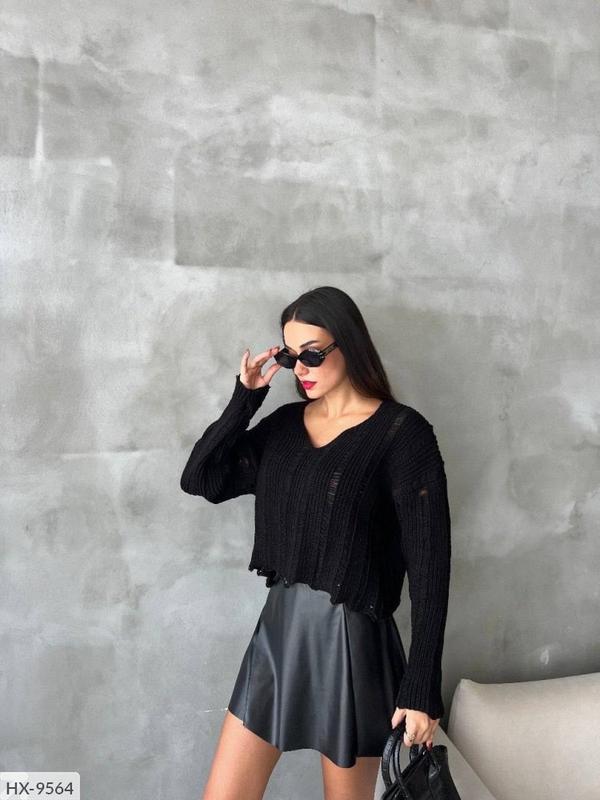 Светр HX-9564 модель 1218 Розмiри: 42-50 Виробник Туреччина Стильний светр з актуальним дірочками. Крій оверсайз, спущене плече, v-подібний виріз горловини-все це робить цей светр зручним і стильним одночасно Заміри, похибка вимірювання + - 1см Пог-64 см Довжина -46 см Довжина рукава від ворота-79 см