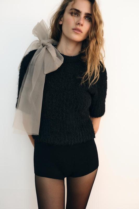 Ціна 1830 Топ з круглою горловиною і короткими рукавами. Комбінована деталь бант з органзи. Чорний | 2756/127