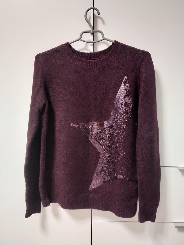 Свитер красивого винного цвета. В хорошем состоянии. Размер м-л. Звезда из пайеток. По резинке и манжетам есть нить люрекса