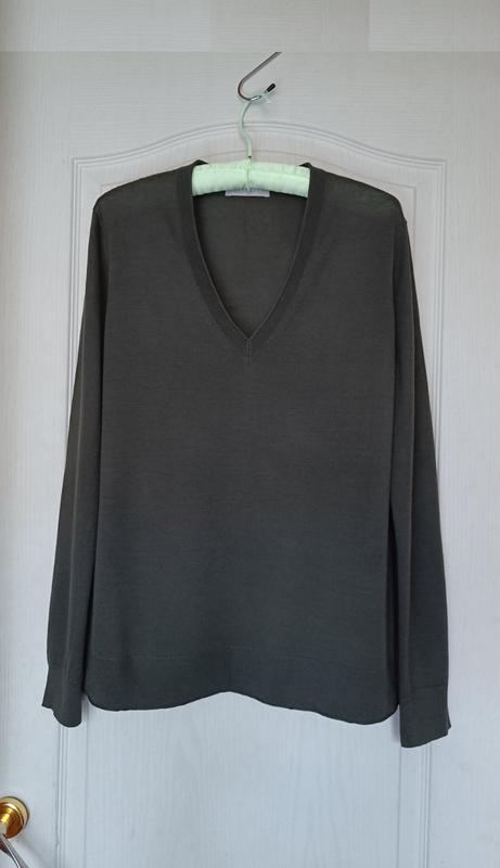 Новий пуловер кольору хакі від італійського бренду Stefanel. Склад: 100% вовна мериноса. Тонкий, мякий, ніжний, не колеться. Дуже приємний до тіла. V-подібний виріз горловини. Ребристі горловина, манжети на рукавах, низ светра. Класичний прямий крій. Стан нової речі без паперових бірок. Не носився. Без дефектів. Розмір вказаний L. Краще орієнтуйтесь на заміри: Ширина плечі – 40,5 см Напівобхват грудей – 51,5 см Ширина внизу (резинка без розтягування) – 49,5 см Довжина по середині спинки – 67 см Довжина рукава – 63,5 см, довжина плеча – 15 см Всі заміри зроблені без розтягування. Пуловер тягнеться.