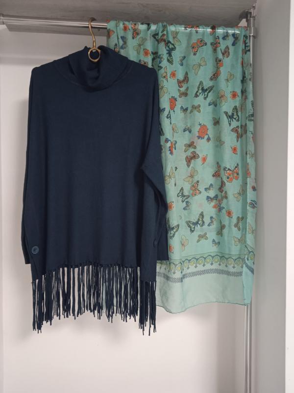 Цікава однотонна кофтинка з довгим рукавом темно бірюзового кольору. Тепла та комфортна. Приємна на дотик. Гладка машинна в'язка. Нитка середньої товщини. Стрейч. Фасон прямий. Лягає вільно -оверсайз. По боках на гудзичках. Плечі спущені. Закрита шия. По низу прикрашена китицями. Гарно виглядає з шарфом в тон у комплекті (шарф може бути замінений, але в кольорі). Є розміри. 52р на пог-56-58 50р на пог-54-56