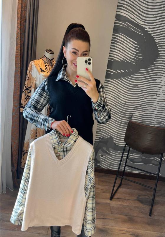 стильний та актуальний предмет одягу, що поєднує в собі елементи кофти та блузки, створюючи враження, ніби під кофтою вдягнена блузка, вона має вшиті деталі комірець та рукава , які визирають з-під жилетки, такий стиль ідеально підходить для офісу, ділових зустрічей або повсякденного використання, кофта виготовлена з ансамблю двох тканин трикотажу машинної в'язки і теплої байки з красивим малюнком, кофта декорована різнокольоровими ґудзиками розмір єдиний 42-44 довжина 63-64 см, об'єм грудей 101-102 см по виробу, довжина рукава від шиї 69-70 см код 208