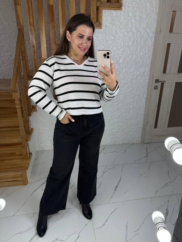 тепла , мʼяка вʼязка , якісна та приємна на дотик тканина Світер Модель 991VL Розміри : 44-46, 48-50, 52-54 Кольори : капучино , білий , чорний Тканина : вʼязка( виробництво Туреччина ) Принт : полоска Теплий світерок з v-образним вирізом , довгий рукав Параметри моделі-норма ОГ90, ОТ68, ОС96, зріст 175см , на ній 44-46. Параметри моделі-батал ОГ112, ОТ88, ОС112, зріст 165см, на ній одягнений розмір 52-54 Заміри виробу : Розмір 44-46: Обʼєм грудей 106 Обʼєм талії 100 Довжина рукава 52 Довжина по спинці 46 Розмір 48-50: Обʼєм грудей 112 Обʼєм талії 106 Довжина рукава 52 Довжина по спинці 47 Розмір 52-54: Обʼєм грудей 122 Обʼєм талії 110 Довжина рукава 53 Довжина по спинці 48
