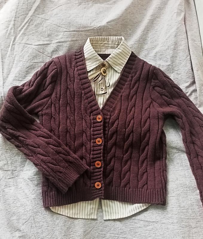 Теплий в'язаний светр, під низом обманка сорочка, та значок в комплекті. Заміри: Довжина -50 Плечі -38 Талія-42 Груди-46 Довжина рукава - 59 Кофти в дуже гарному стані, дефектів немає, вишита якісно.