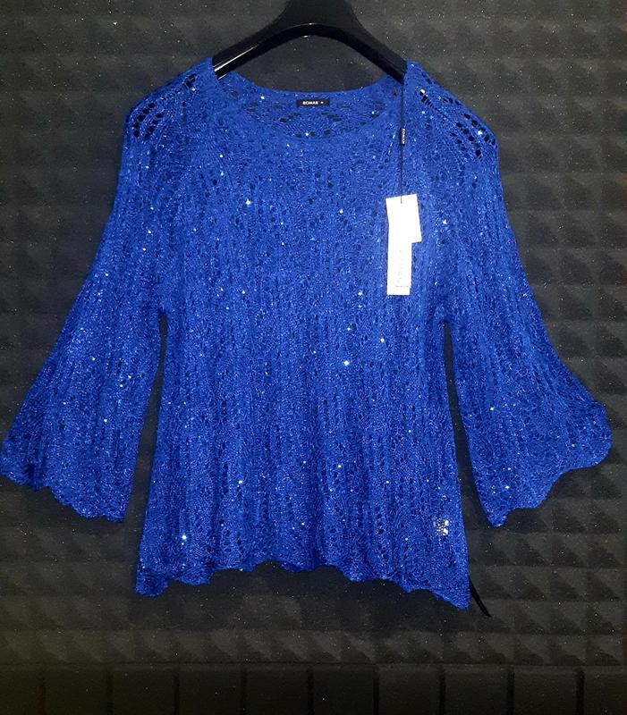 Дивіться в моєї Шафі багато стильного одягу, ефектних купальників та гарної білизни на пишну красу🥰 Можливі замовлення на щось конкретне. Сміливо задавайте питання- з задоволенням відповім)) ❤❤❤❤❤❤❤❤❤❤❤❤ Яскравий ефектний светр з колекції англійського бренду ROMAN, виконаний із вишуканного ажурного трикотажу із додаванням декору - поеток Колір- королівський синій. Рукав широкий, 3/4. - Простий, необмежуючий рухів фасон. - Класичний круглий виріз. - Довжина рукава: 53 cm. - Довжина: 70cm. - Ширина під пахвами: 54-58 cm.