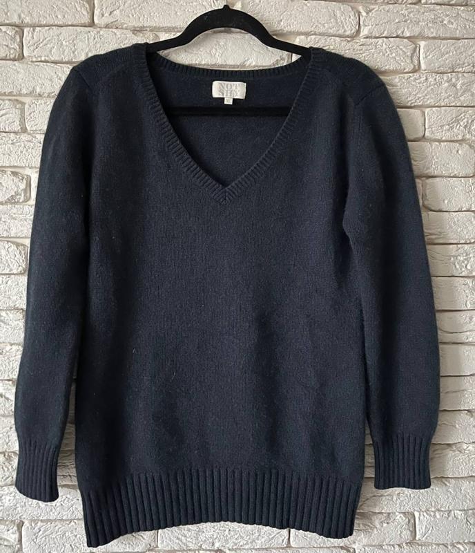 Лаконичный кашемировый свитер, глубокий синий цвет, плотный, толстый, похожий на монгольский. Указан размер xl, но не соответствует. Ширина 44, длина 64, рукав от плеча54.