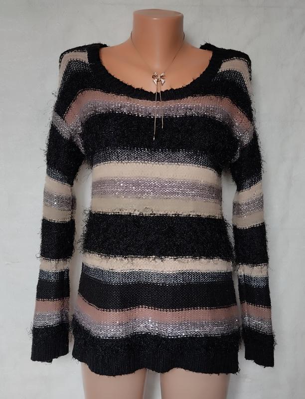 Класний светр джемпер, м'якенький. Кожна смужка зв'язана з різної пряжі: чорна травка, сіра прикрашена пайєтками, інші з люрексовою ниткою. Стан загалом відмінний, трохи розтягнута горловина. Заміри: довжина 67 рукав від горловини 70 пог 42-58 пос 44-63 низ 46-58