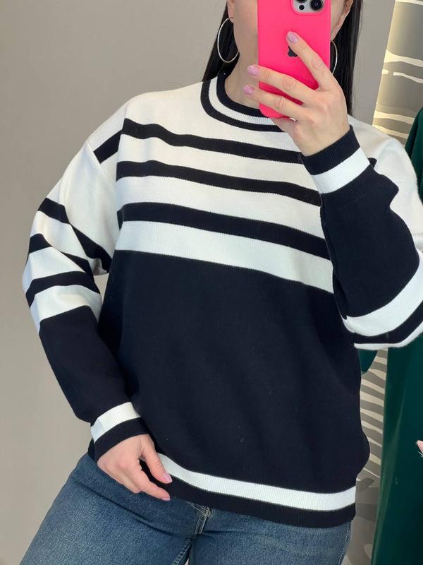 СЕЗОН ОСІНЬ-ЗИМА 🍁🍃🍁 ТЕПЛИЙ, М'ЯКИЙ, СТИЛЬНИЙ І ЗАТИШНИЙ СВЕТР ВІЛЬНОГО КРОЮ З КРУГЛИМ КОМІРОМ НА ГУМЦІ ВНИЗУ І РУКАВАХ, ВИГОТОВЛЕНИЙ З ПРИЄМНОГО ДО ТІЛА ТРИКОТАЖУ МАШИННОЇ В'ЯЗКИ ВИСОКОЇ ЯКОСТІ ДЕКОРОВАНОГО ЕЛЕГАНТНОЮ СМУЖКОЮ РОЗМІР ОВЕРСАЙЗ 48-52 ДЛИНА 62-63 СМ, ОБ'ЄМ ГРУДЕЙ ПО ВИРОБУ 112 см, ДОВЖИНА РУКАВА ВІД ШИЇ 68 СМ КОД 0610