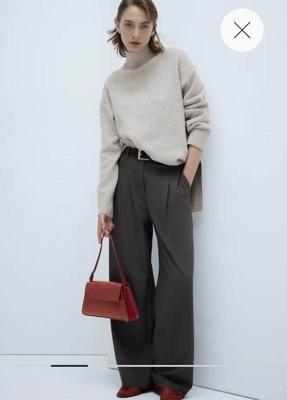 Свитер большого размера из мягкого трикотажа с добавлением шерсти. Ворот водолазка в рубчик с V-образным вырезом, спущенные плечи. Широкие рукава с манжетом. Завязка внизу свитера и длинные разрезы по бокам