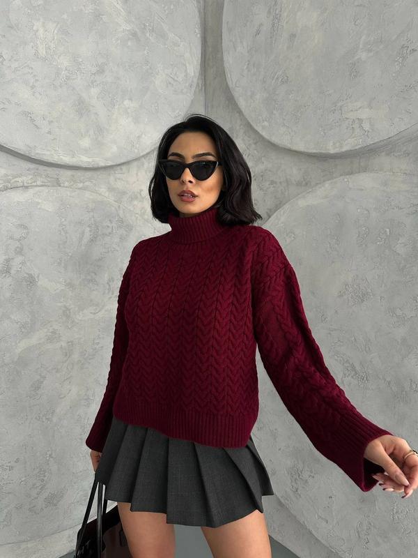 В’язаний светр з високим коміром, текстурою у вигляді косичок та вільним фасоном. Ідеально підходить для стильних та комфортних образів. Виробник: Туреччина Розмір: 42-46 Тканина: 70% вовна, 30% акрил Колір: чорний, молочний, графіт, бардо Виміри: Довжина 52см Обг 120см Рукав довжина від шиї 65см №3028