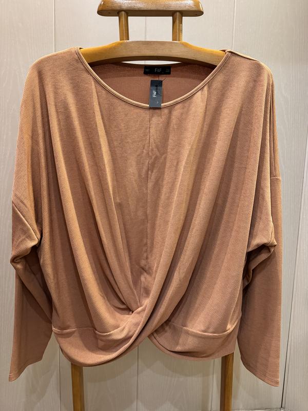 У наявності красива кофточка фірми F&F. Розмір вказаний 22 US 18. красиво сяде на 18. Склад: 93% поліестер і 7% еластану...тканина дуже м'яка та приємна до тіла, добре тягнеться. ПОГ-крі вільний...приблизно 67, довжина-59, плечі приспущені...довжина рукава від коміра-70, ширина по низу-60+ще добре тягнеться.