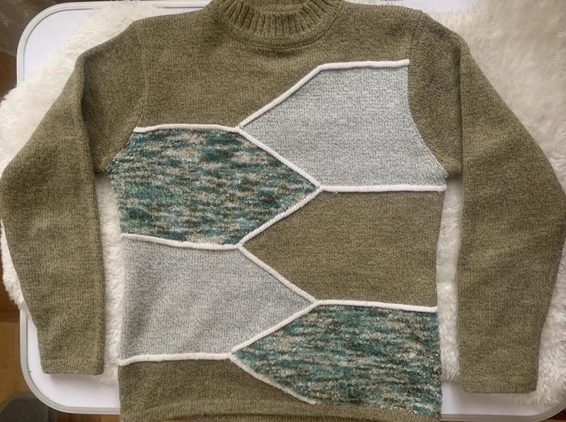 в’язаний светр з меланжевими вставками та переходом між відтінками. Такий візерунок, додає виробу сучасний стиль. Колір коричнево-зелений.Б/У, в гарному стані, довжина рукава 55 см. Довжина светра 52 см, ширина 44. розмір 44(S)