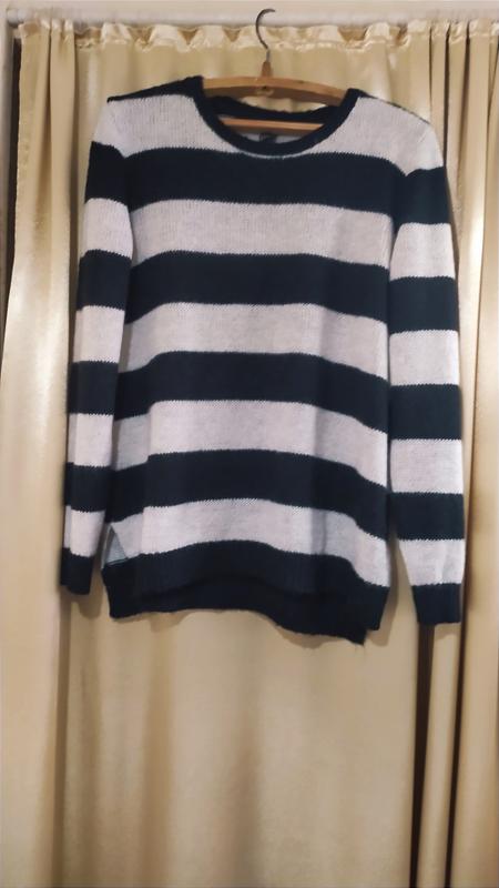 дуже гарний майже новий, в ідеальному стані, сучасний светр жіночій сірого та чорного кольору, поєднані між собою смужками, м'який, теплий, легкий, довгий, з розрізами по бокам, перед трішечки короткий на одну сиужку, зад довше. заміри :плече 12,довжина рукава 68,пройма 24,,півобхват грудейв спокійному стані 60,прямий , низ в спокійному стані 58 + розрізи висотою низу 16,довжина попереду 70,позаду 76.