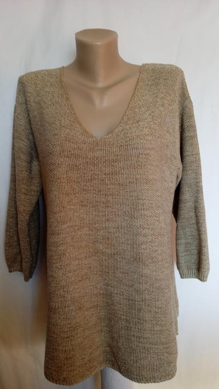очень красивый мягкий свитер,трикотаж бежевый цвет с золотистой люрекс нитью,свитер нарядный, длина78,пог, промежутк подмышками60,рукав от горловины65,ширина по низу67