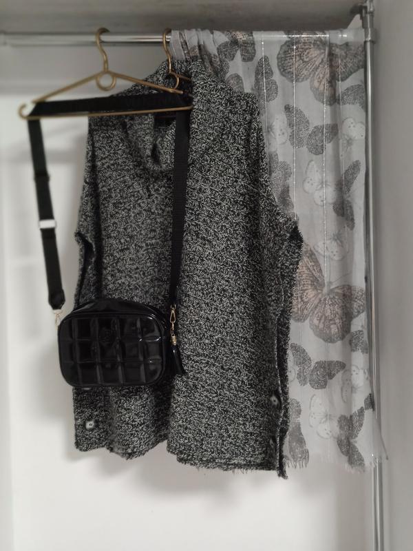 Стильная кофточка с коротким рукавом темно серого цвета (соединены две нити света и темная). Теплая и удобная. Приятная и мягкая на ощупь. Гладкая машинная вязка. Толстовка нить. Стрейч. Удлиненная. Фасон прямой. Ложится свободно -оверсайз. По боках прикрашена гудзичками. Аккуратный хомутик. Надежно смотрит поверх гольфа или блузы. Красиво смотрится с шарфом в тон в комплекте (шарф может быть заменен, но в цвете). Размер универсальный.