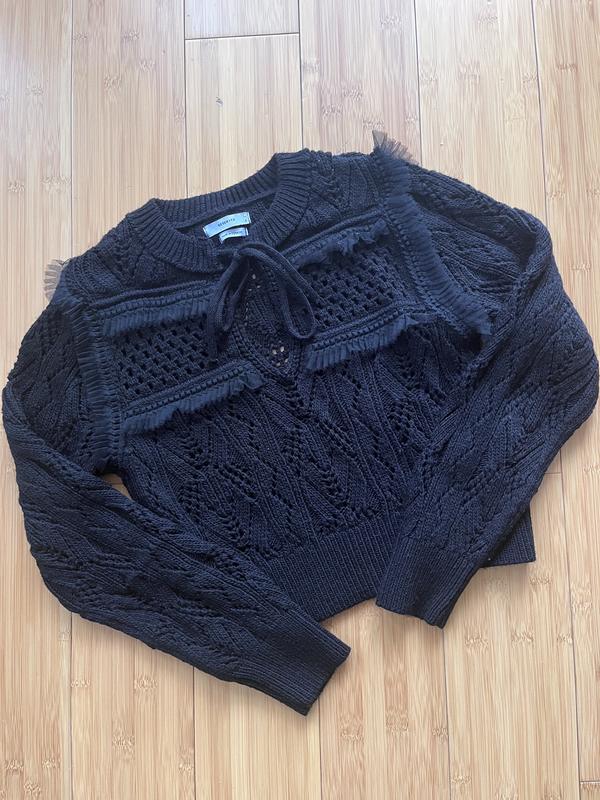 Джемпер прямого крою, виконаний з трикотажу з додаванням вовни. • V-подібний виріз із завʼязаним коміром • деталі з фатину спереду та на плечах • довгі рукави • декоративне плетіння по всій поверхні