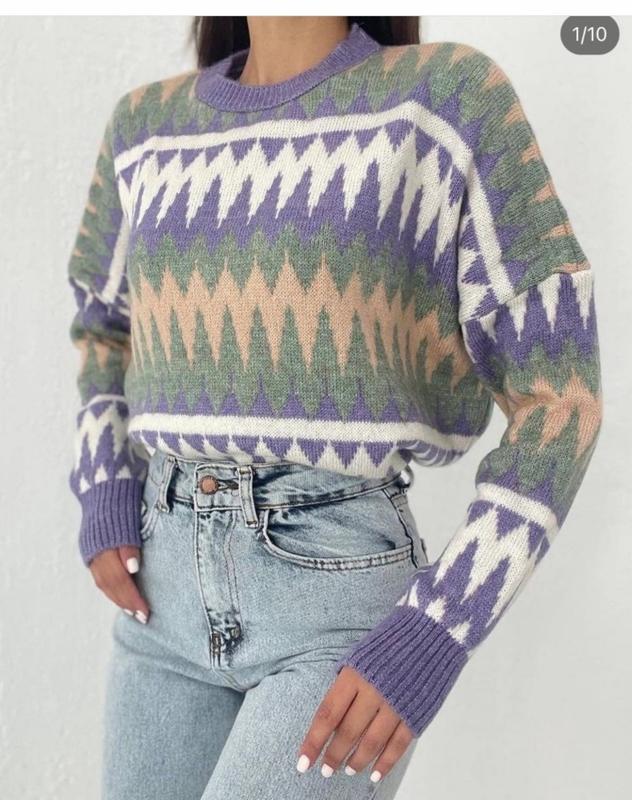 Класний м'який светр виробництва Туреччина, фірма Bisou. Бірка із складом затерлась, тому не можу сфоткати. Светр грубий, не кусючий, м'який, якісний, не кошлатиться. Кольори приємні, принт стильний. Купувала в 2024 за 950 грн. Розмір універсальний, підходить на М-L, рукав приспущений. В моїх оголошеннях є і інший одяг