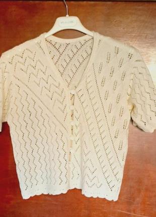 коротка ажурна бавовняна кофточка молочного кольору, стан дуже гарний ширина 46 см довжина 46 см довжина рукава + плече 35 см дод. фото та заміри за запитом