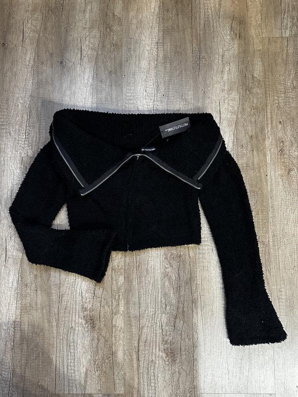 Кофта з відкритими плечима. Гарно сідає по фігурі. Зручна, завдяки змійці можна регулювати виріз, за рахунок чого не підіймається до гори. По бірці S, але я одягла на М, комфортно. Одягала один раз. Фото на собі додам за потреби.
