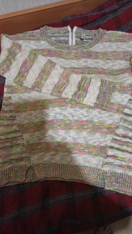 Яскравий светрик з люрексом. Гарно розтягується. Заміри: довжина по спинці -62см, довжина рукава -58см, пог-57см.