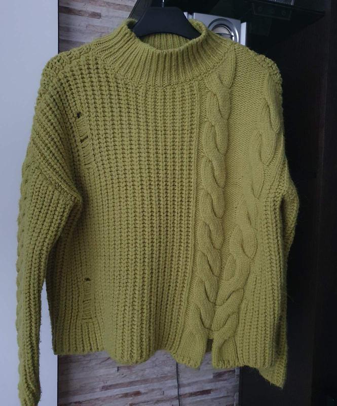 светр приємного світло- оливкового кольору з широкою косою та сучасним трендом-імітацією спущених петель. Низ светра вільного крою. На зріст 162,163 см,розмір s-m. довжина від плечового шва біля ворота 50см,ширина внизу 52 см,довжина рукава від горловини по плечового шву 65см.
