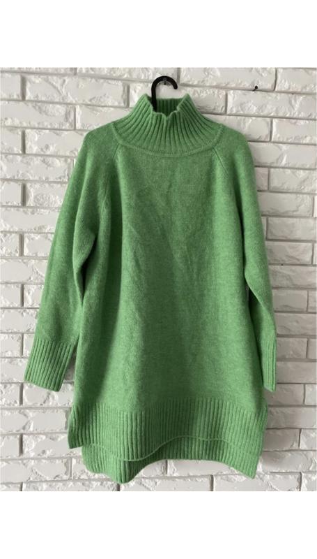 Гарний светр теплий салатовий під горло л 12 Довжина переда 74, заду 80 Рукав від шиї 63 Напівобхват грудей 55 Талії 54 Стегон 56 Акрил