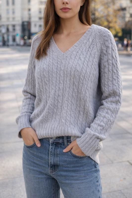 Це теплий і стильний в’язаний светр від GAP, виконаний у класичному дизайні з рельєфним візерунком «коси». Він має V-подібний виріз, що додає елегантності та робить його універсальним для різних образів. Светр виготовлений із вовняної суміші, що забезпечує комфорт і зігріває в холодну погоду. Деталі: • Бренд: GAP (Gap Stretch) • Матеріал: Вовняна суміш • Колір: Світло-сірий / Лавандовий відтінок • Виріз: V-подібний • Текстура: Об’ємний візерунок «коси» • Манжети та нижній край: Ребристі для кращої посадки Цей светр чудово підходить для створення затишного повсякденного або ділового стилю, легко поєднується з джинсами, брюками чи спідницями.
