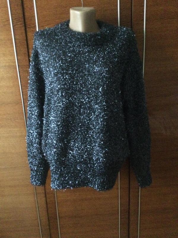 Хоч і весь люрексовий, але не кусається. Мякенький дуже. ПОГ до 80 см. Плечі спущено. Тому довжина від горловини -77 ми. Довжина виробу від плеча -63 см. До бедер светрик